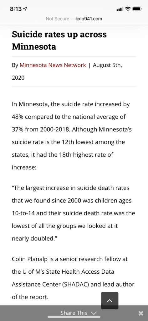 Data has shown that the number of suicides in Minnesota has increased in the last year to 48%, well over the national average of 37%. Suicide rates among youth have doubled in the past year. Many mental health organizations have recognized that this is the result of lack of access to care and persistent isolation. Rates of suicide have also markedly increased in the elderly presumably for the same reason.