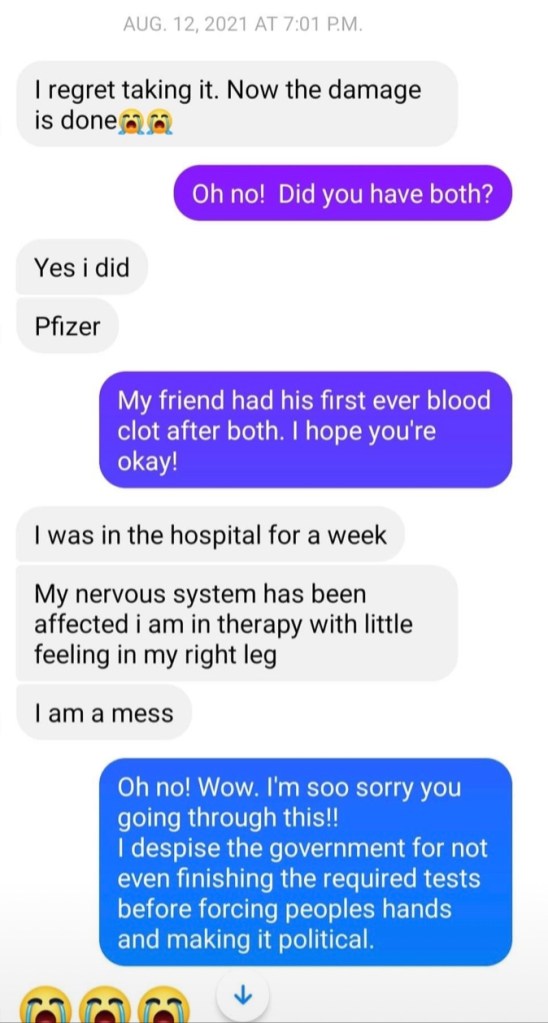 Regarding side effects- particularly blood clots and reports of unusual nerve activity- I personally know two people that have been suffering from nerve pain and neuropathy after getting the Covid shots. My lab technician friend sent me this: