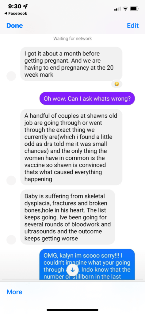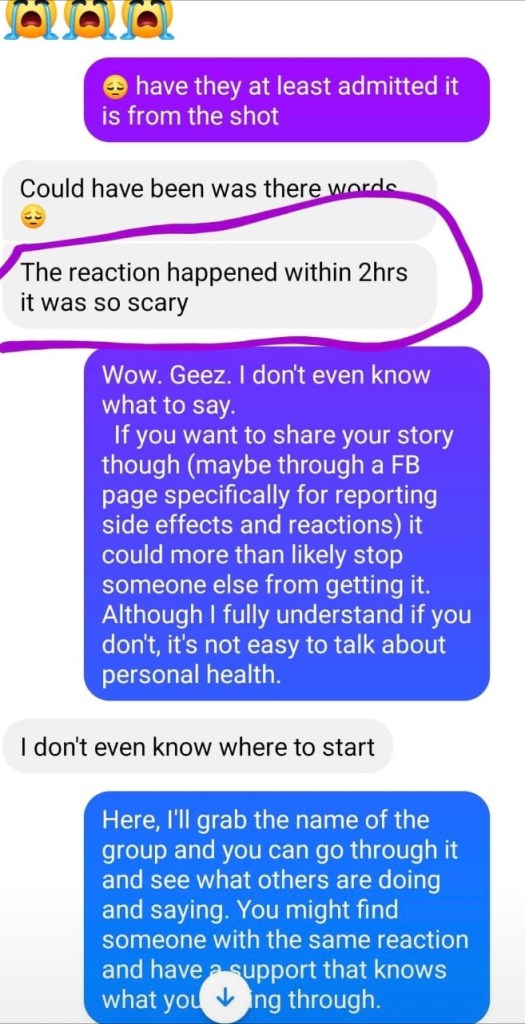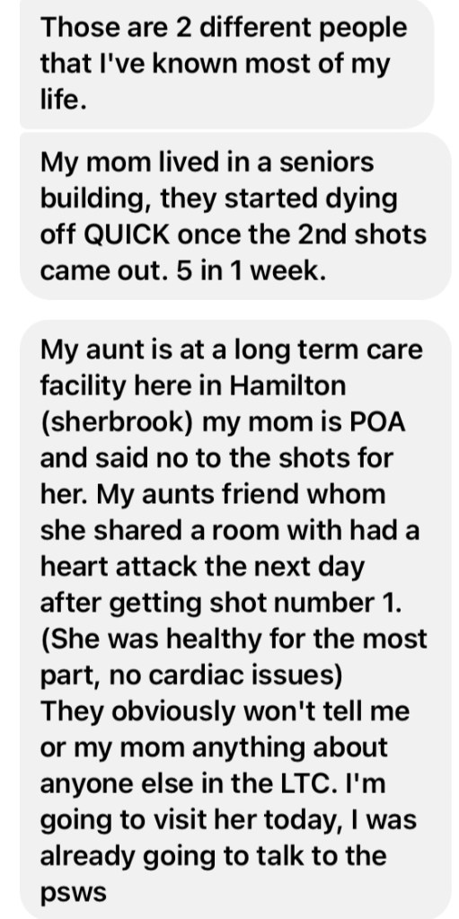 The collection of info above- I have not fully vetted for accuracy. However, I sent it to a lab technician friend who is reviewing it with me. She was more interested in taking the experimental shot while pregnant and effects on the fetus. Here is what she shared with me- names have been cropped out to protect privacy.